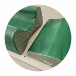 Einfarbig in blau, weiß, türkis und rot sowie in verschiedene Farbkombinationen, aus einem wasserabweisenden und desinfizierbaren Bezug, formstabil, strapazierfähig.