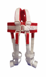 Die Beingurte (4) (hinten verlaufend) werden an den hinteren Schließen bzw. D-Ringe des Brustgurtes befestigt. Die Beingurte (3) + (4) werden durch die Klettverschlüsse (5) oberhalb der Ferse und um den Unterschenkel fixiert.