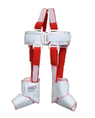 Die Beingurte (3) und (4) sorgen für eine korrekte Bein- und Hüfthaltung, und eine sichere Verhinderung der Beinstreckung vom 1.Lebenstag an für die gesamte Therapiedauer.